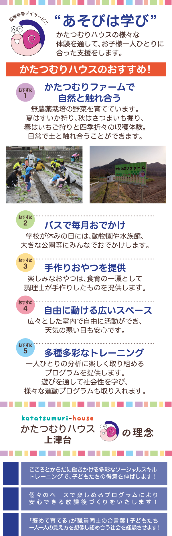 放課後等デイサービスかたつむりハウス上津台はスムーズな社会生活を送るための療育を行っていきます。